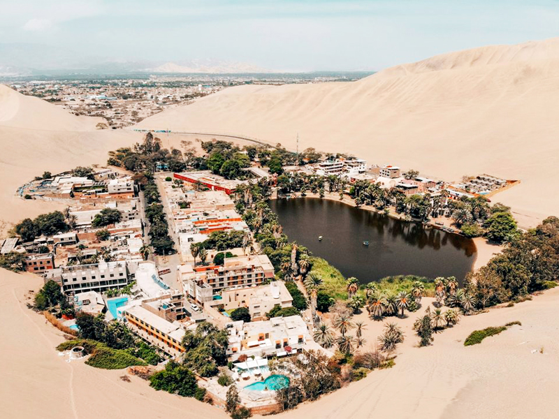 El oasis de Huacachina, ubicado a 5 km de la ciudad de Ica, está rodeado de grandes dunas de arena, adecuadas para practicar el deporte denominado sandboard, así como otros deportes de aventura.